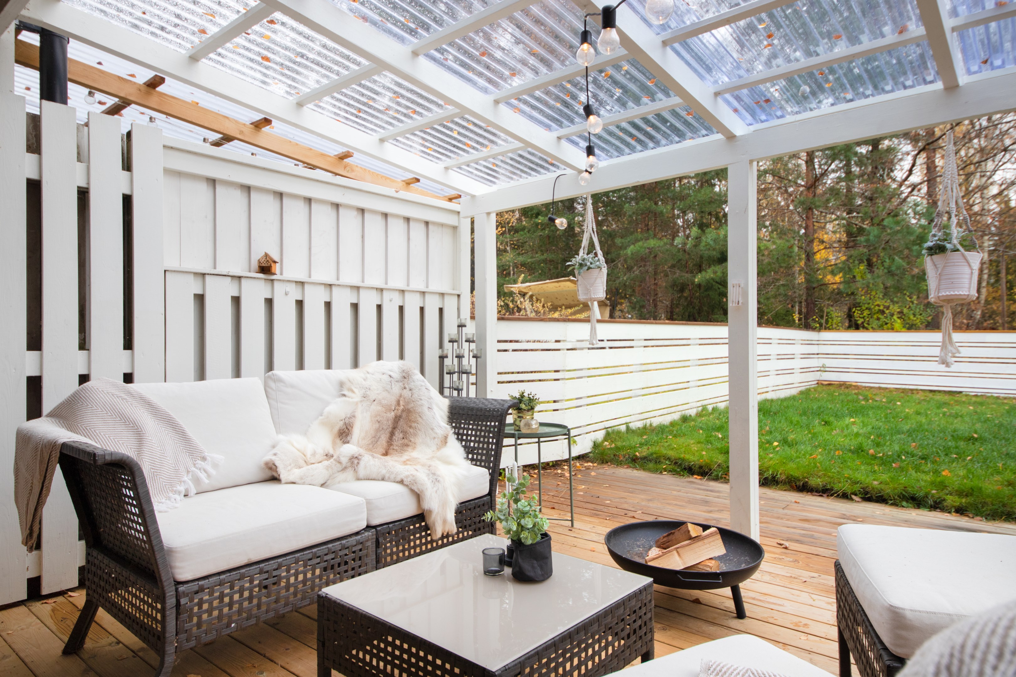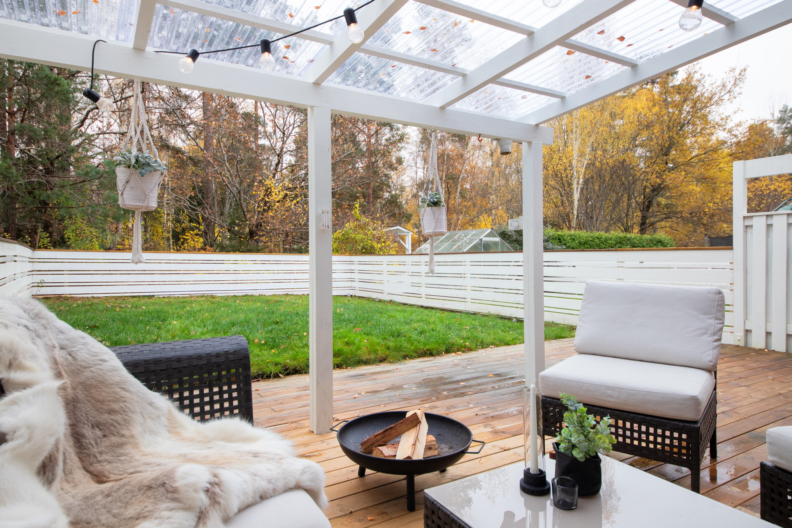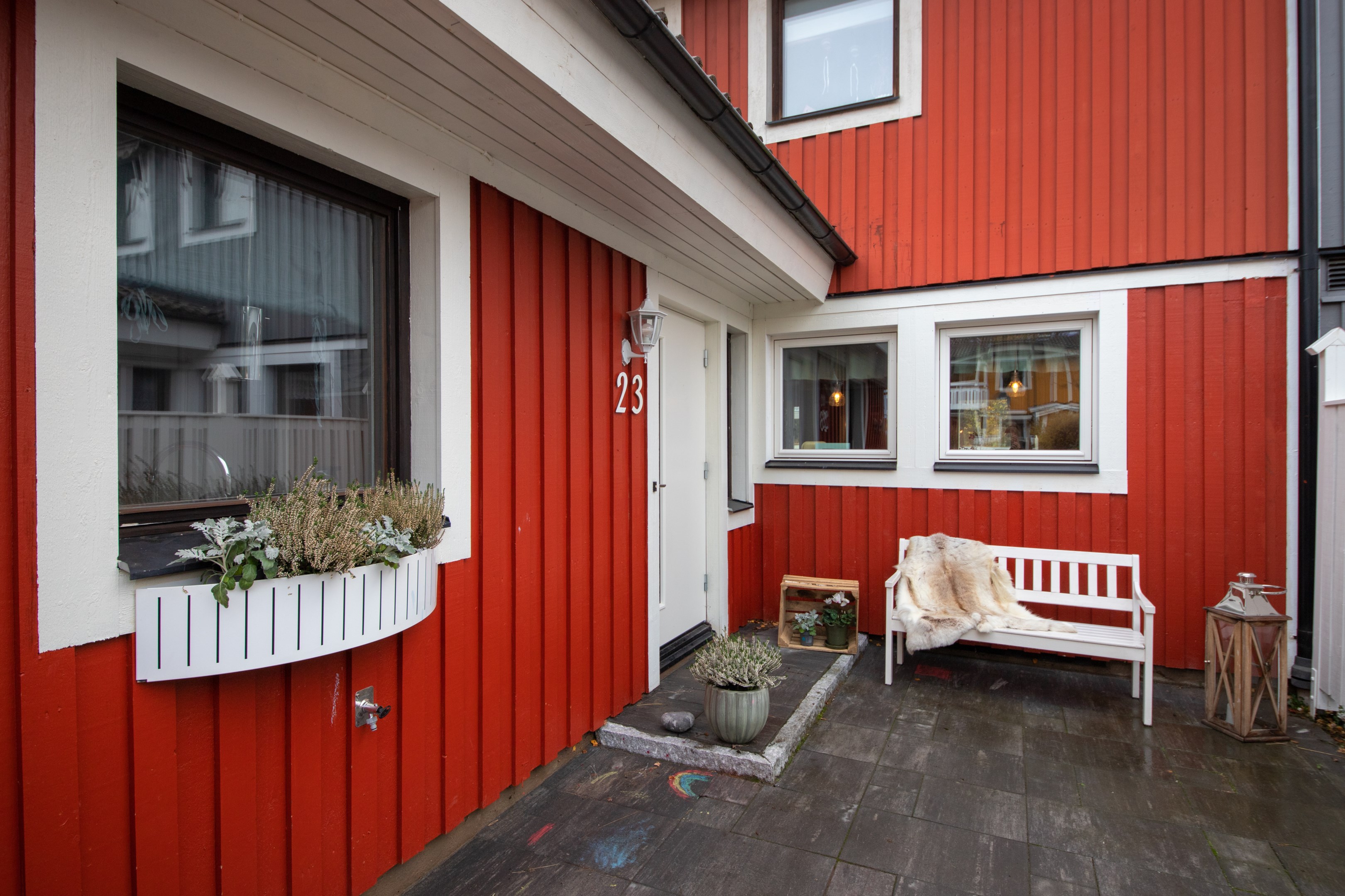 Framsida med smakfull stenläggning. Baksida med altan samt gräsmatta inhängnad av staket runt om.