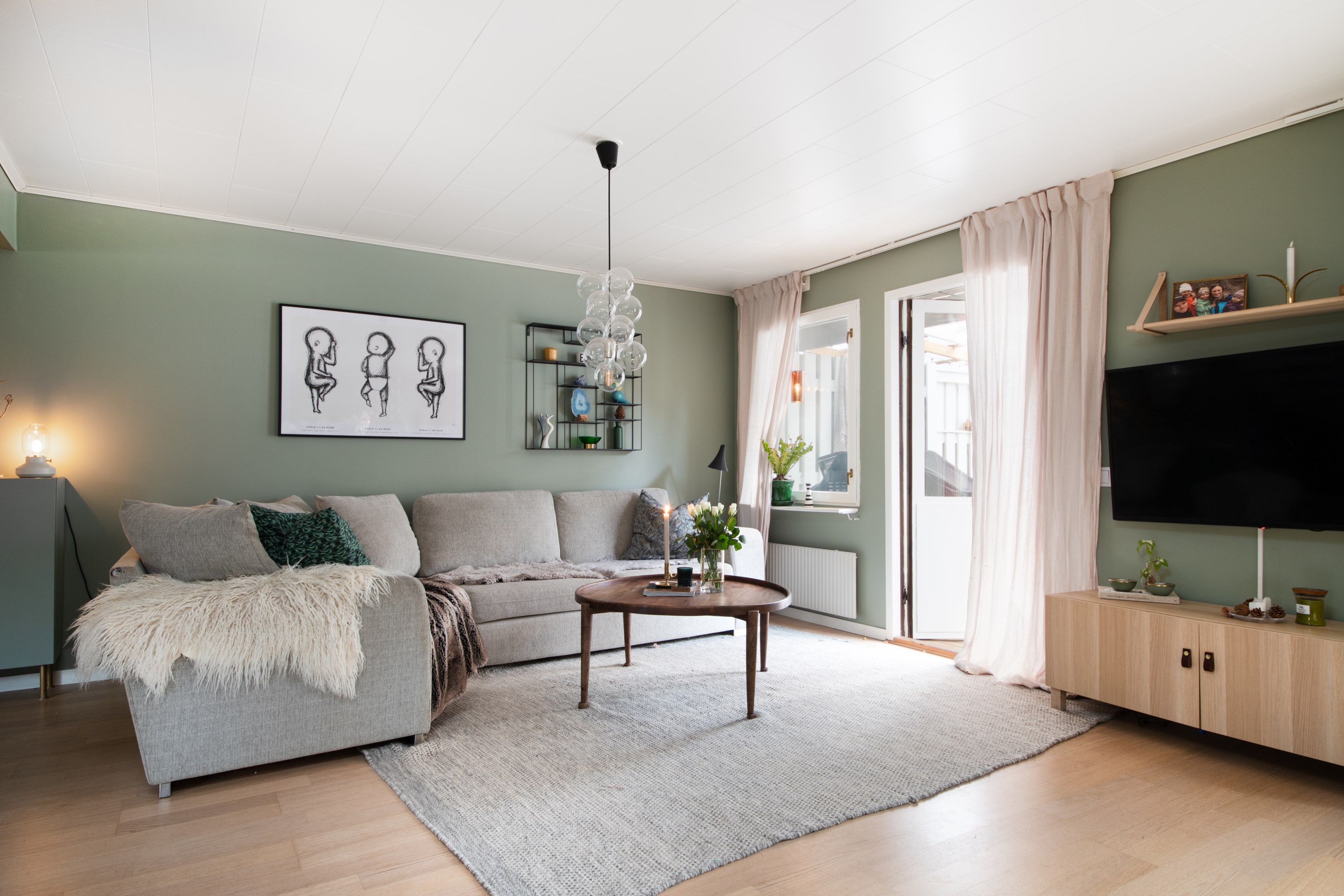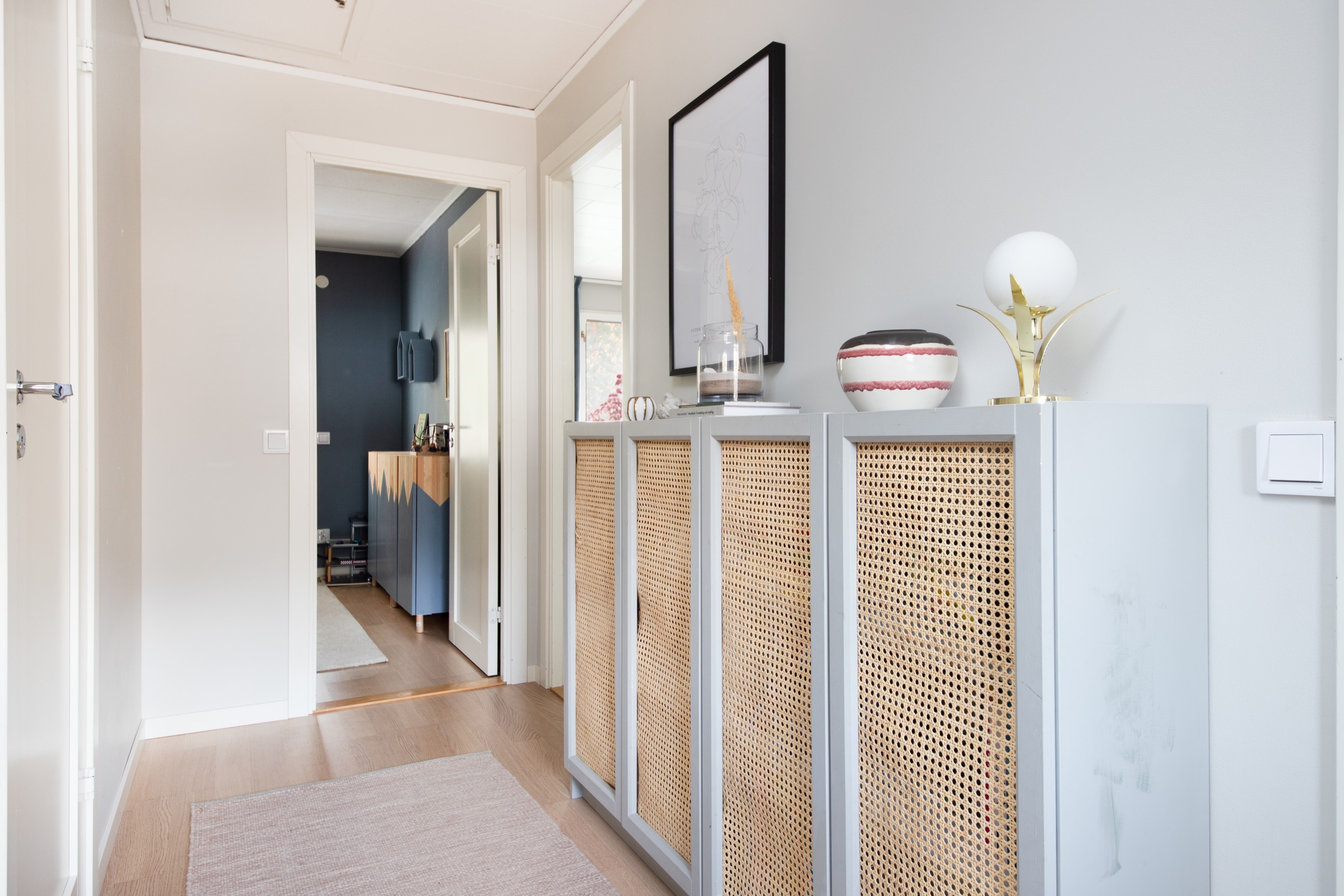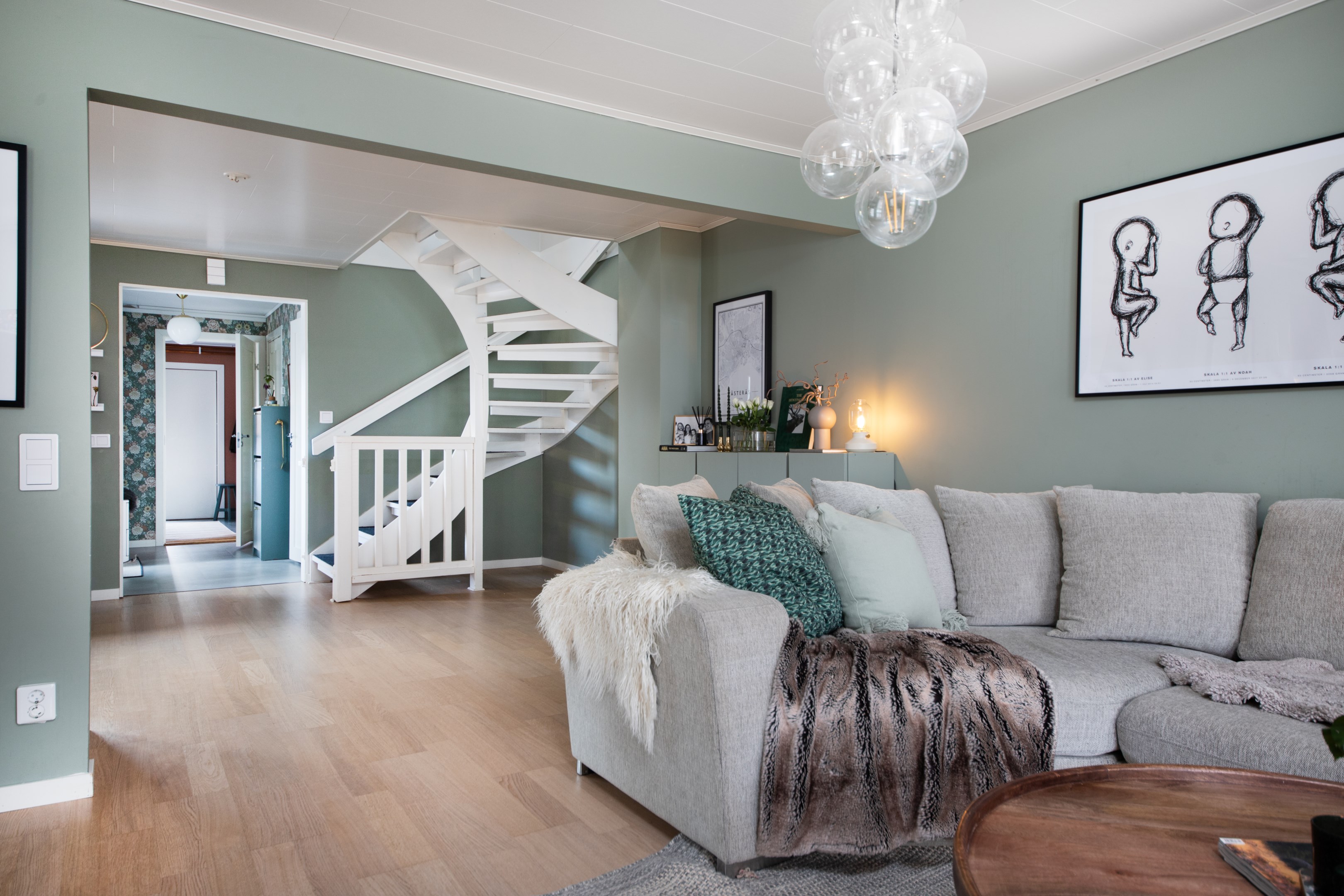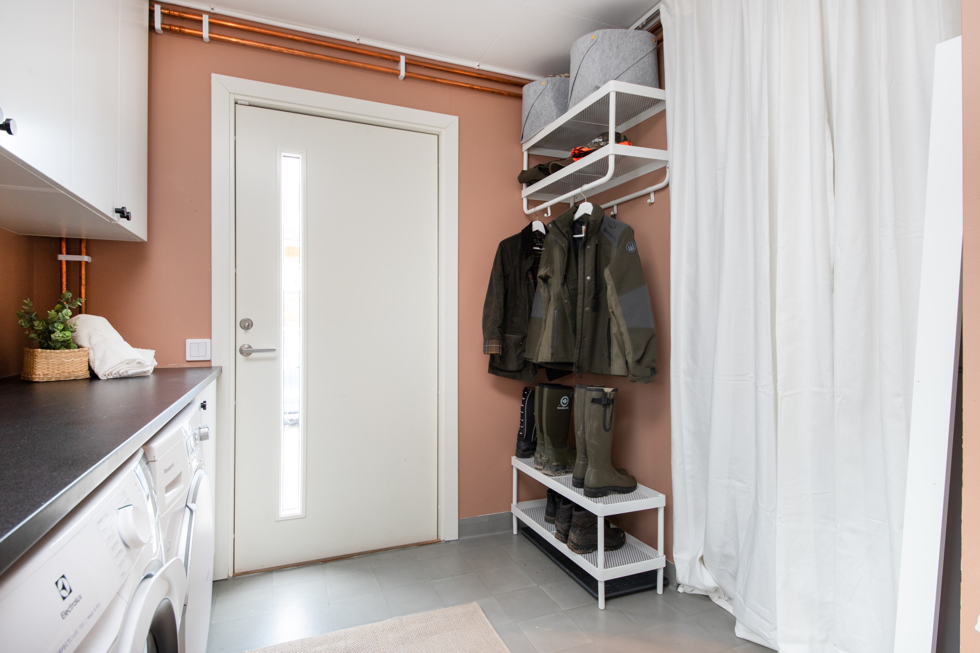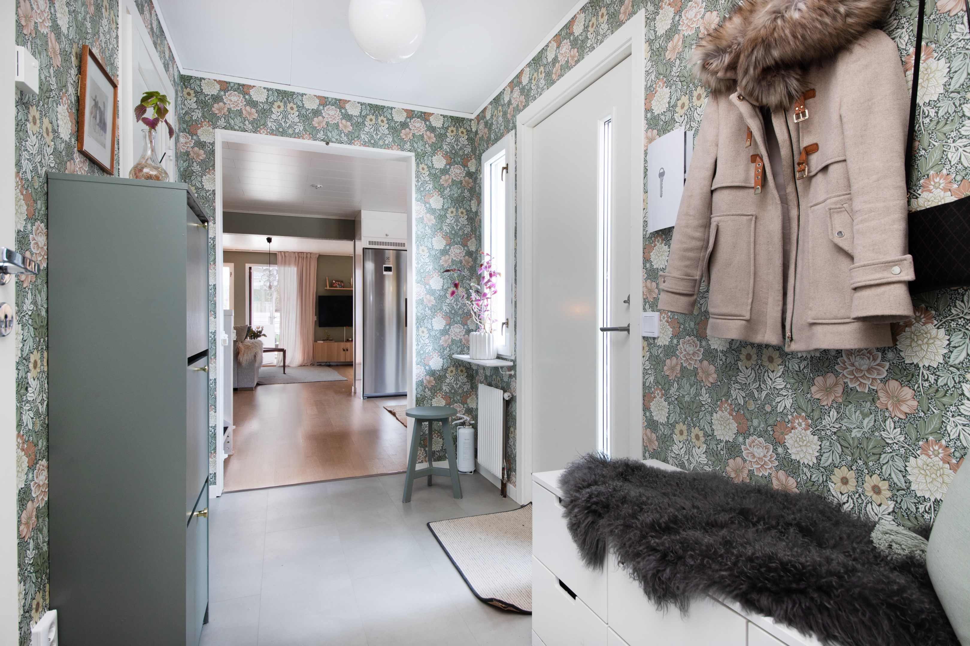 ENTRÉPLAN Entré in i hall med gott om plats för avhängning av ytterkläder. Här råder gott ljusinsläpp med både sidofönster och fönster i ytterdörren. Snyggt och praktiskt vinylgolv och tapetserade väggar. Klädkammare/förråd intill. I anslutning till hallen finns också den rymliga tvättstugan med groventré som är perfekt att använda som vardagsentré. Även här råder ett gott ljusinsläpp med både fönster vid arbetsbänken/tvätthon samt även fönster i ytterdörren. Här finns gott om arbetsytor och förvaringsmöjligheter. Ny kombinerad tvätt och torktumlare, det finns även en separat torktumlare. Värmepumpen finner ni också här. Målade väggar och praktisk plastmatta med klinkermönster på golvet. Renoverat och helkaklat badrum med ingång från hallen. Här finns dusch bakom glasväggar, handfatskommod, spegel samt wc. Renoverat och utbyggt kök. Öppen planlösning mot vardagsrum och matplats. I köket finns otroligt gott om både arbetsytor och förvaring. Nya fönster ovanför arbetsbänken. Vita köksluckor, svart bänkskiva, mässingsknoppar och mässingskran - allt i smakfull kombination. Mosaikkakel ovanför arbetsbänk. Köket är utrustat med kyl, frys, inbyggnadsugn, inbyggnadsmicro, spishäll och diskmaskin. Vardagsrum med gott om fönster och plats för både soffor och matbord. Här finns utgång till altan och baksida. ÖVRE PLAN Hall med målade väggar och tarkett-golv. Sovrum 1 har målade väggar och en fondvägg, likadant golv som i hallen. Sovrum 2 är riktigt stort och i anslutning till detta sovrum finns inredd klädkammare. Målade väggar och mysig heltäckande textil matta. Sovrum 3 med utgång till balkong. Målade väggar och likadant golv som i hallen. Smakfullt renoverat och helkaklat badrum. Här finns badkar, handfatskommod, spegel med belysning samt handdukstork. Golvvärme (el).