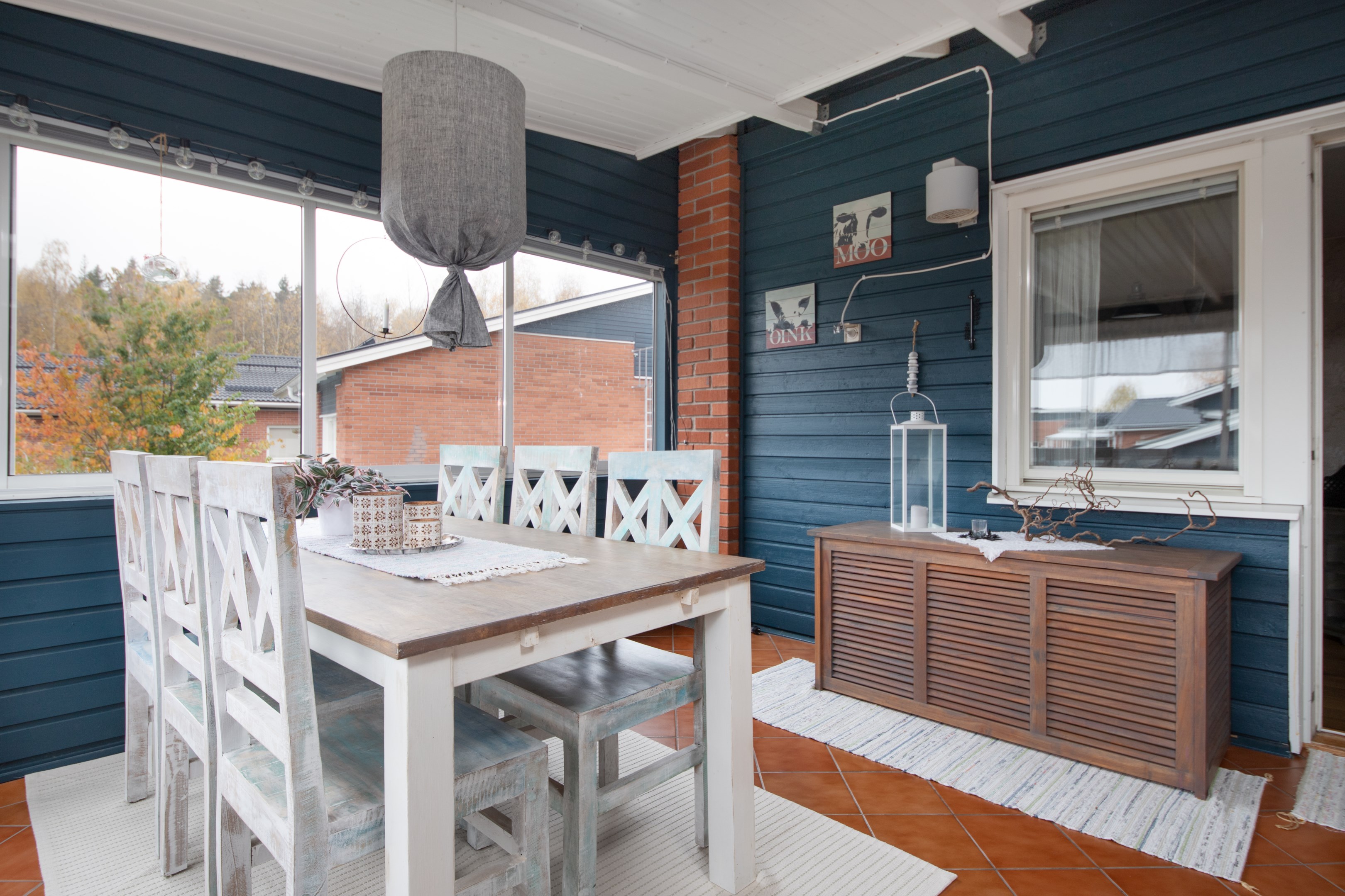 ENTRÉPLAN Egen entré i markplan. På entréplanet finner ni rymlig hall med goda förvaringsmöjligheter och klädavhängning. Här finns en dubbelgarderob med spegeldörrar. Trappa upp tar er till övriga delar av lägenheten. ÖVERVÅNING Rymlig övre hall med parkettgolv och ljusa väggar. Här finns utgång till den stora härliga inglasade terrassen i söderläge. Här finns gott om svängrum. Otroligt smakfullt renoverat kök. Här finns gott om både arbetsytor och förvaringsmöjligheter. Här finns kyl/frys, diskmaskin, inbyggnadsugn, micro och spishäll. Härlig plats för matbord framför fönster med utsikt mot skogsdunge. Vardagsrum med ljusinsläpp från två väderstreck. Ljusa väggar och parkettgolv. Sovrum 1 med tre garderober. Rogivande mönstrad tapet och parkettgolv. Tvättstuga med våtrumsmatta på väggar och golv. Här finns tvättmaskin, torktumlare samt tvättho och rostfri arbetsbänk. Helkalklat badrum med inbyggt bubbelbadkar, handfatskommod, spegel och wc. Dusch med kakel på väggar och klinkergolv. Här finns dusch bakom skjutbar duschvägg, handfatskommod spgelskåp samt förvaringsskåp. Sovrum 2 med parkettgolv och tapetserade väggar. Sovrum 3 med parkettgolv och ljus mönstrad tapet.