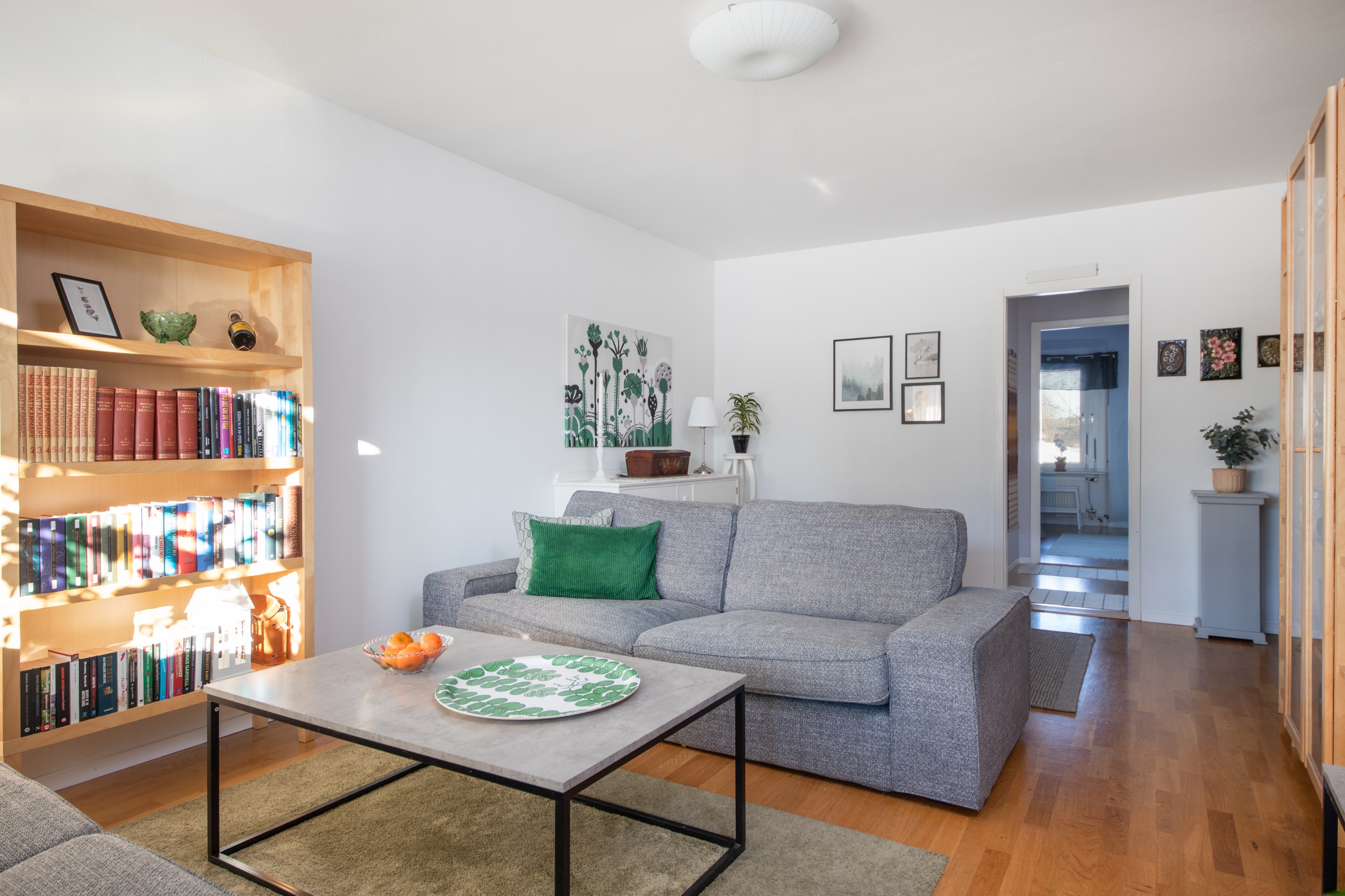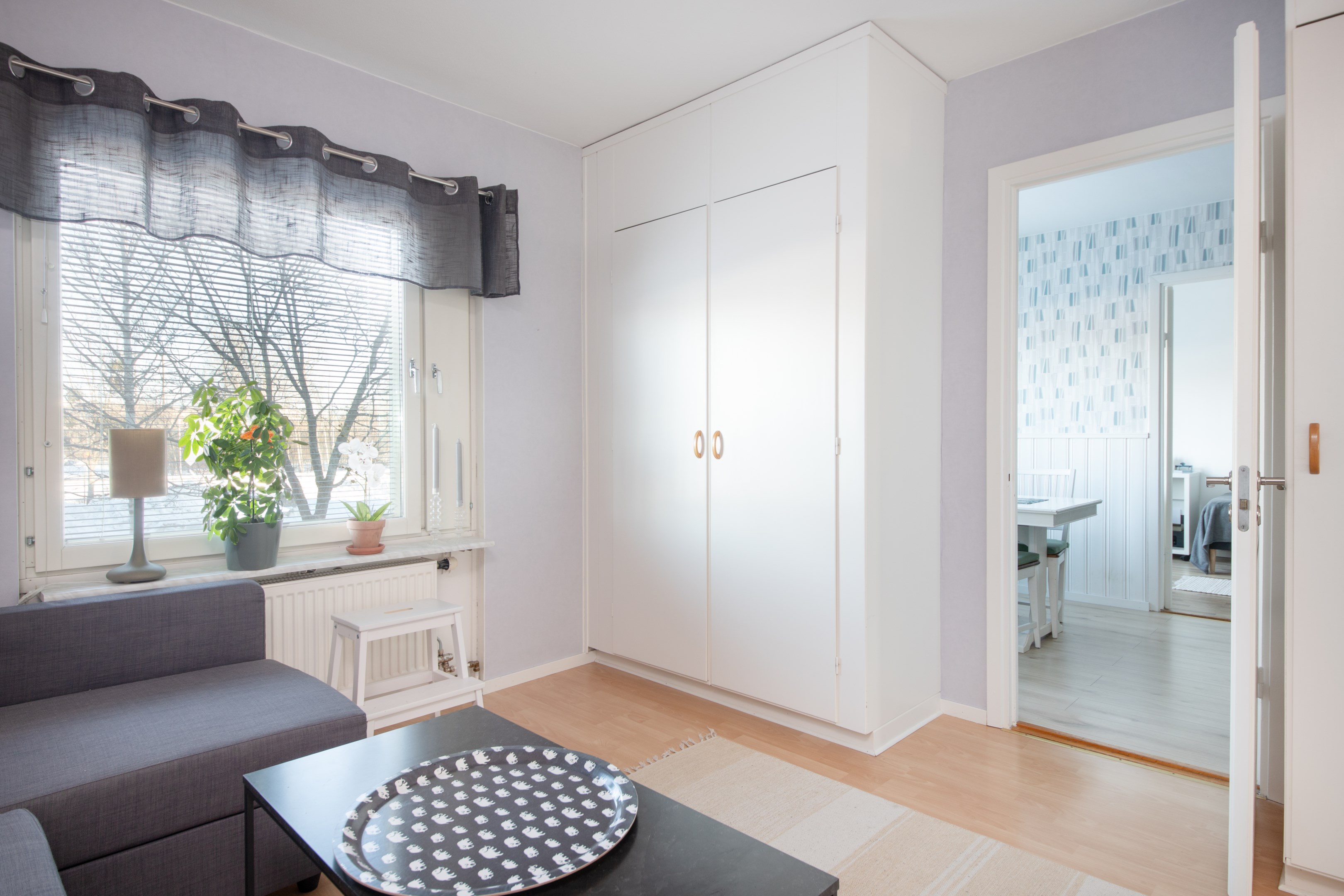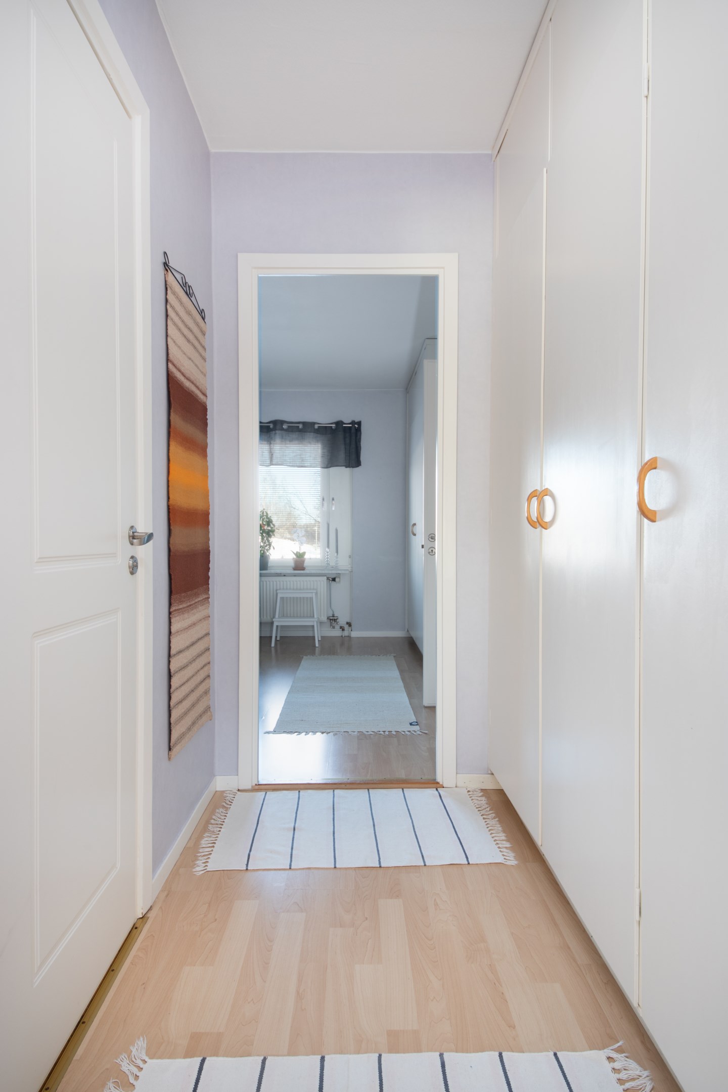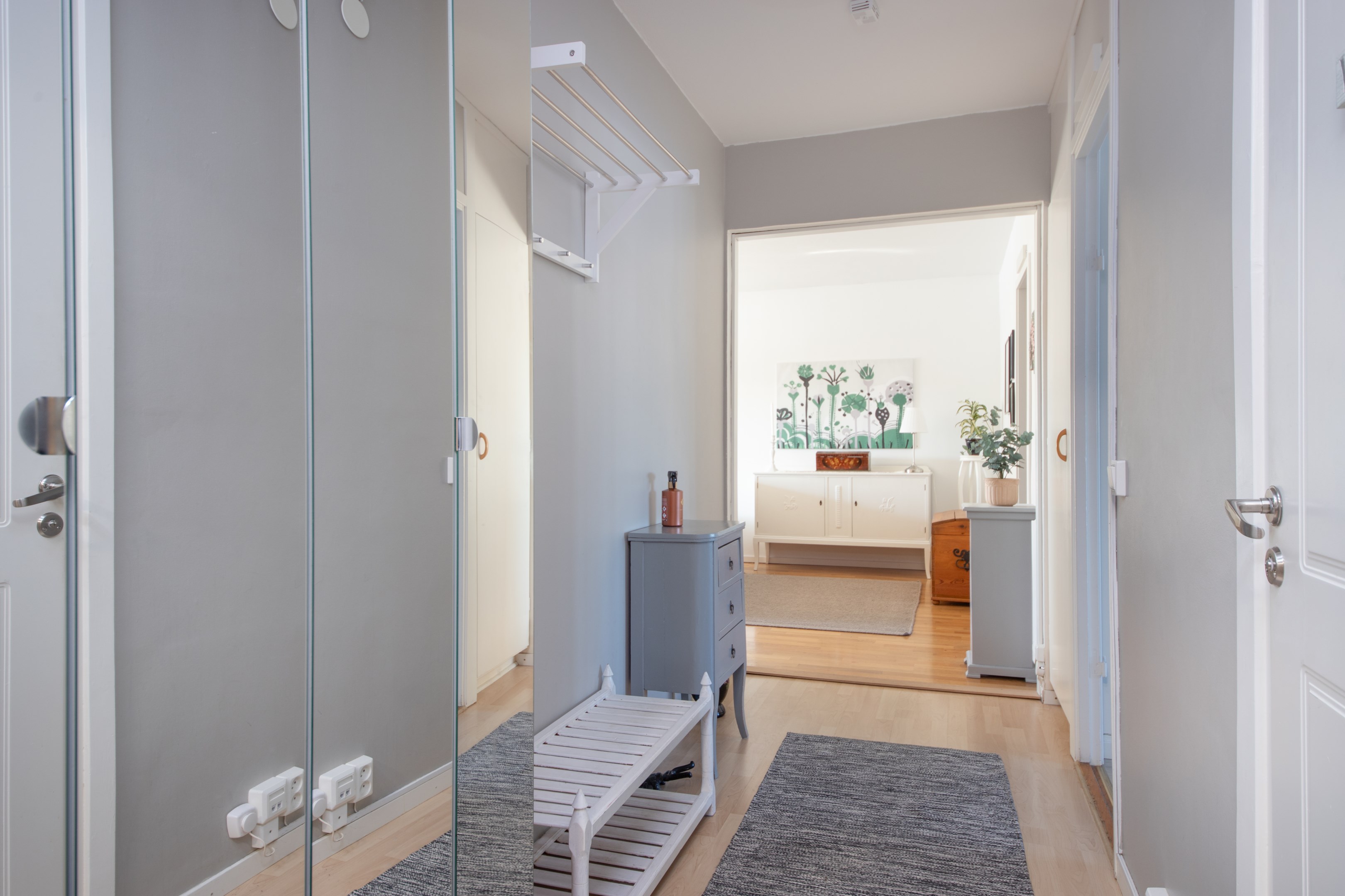 Entré in i praktisk hall med garderob och gott om plats för avhängning av ytterkläder. Laminatgolv och ljusa väggar. Intill hallen finns Wc utrustat med wc, handfat och spegel. Mycket smakfullt renoverat kök med gott om både arbetsytor och förvaringsmöjligheter. Matchande bänkskiva och stänkskydd. Köket är utrustat med delad kyl/frys, integrerad diskmaskin, inbyggnadsugn, inbyggnadsmicro samt spishäll. Rymlig matplats med trivsamt fönsterläge. Två sovrum av bra storlek. Båda med laminatgolv och ljusa väggar. Det ena sovrummet har access från både kök och vardagsrum/inre hall. Detta sovrum har riktigt gott om garderober. Rymligt vardagsrum med fint parkettgolv, ljusa väggar och utgång till balkongen i härligt soligt söderläge. Mellan vardagsrummet och det ena sovrummet finns en inre hall med gott om garderober samt ingång till badrummet. Badrummet har kaklade väggar och våtrumsmatta på golvet. Här finns ny handfatskommod och nytt spegelskåp. Utöver detta är badrummet även utrustat med dusch och tvättmaskin.