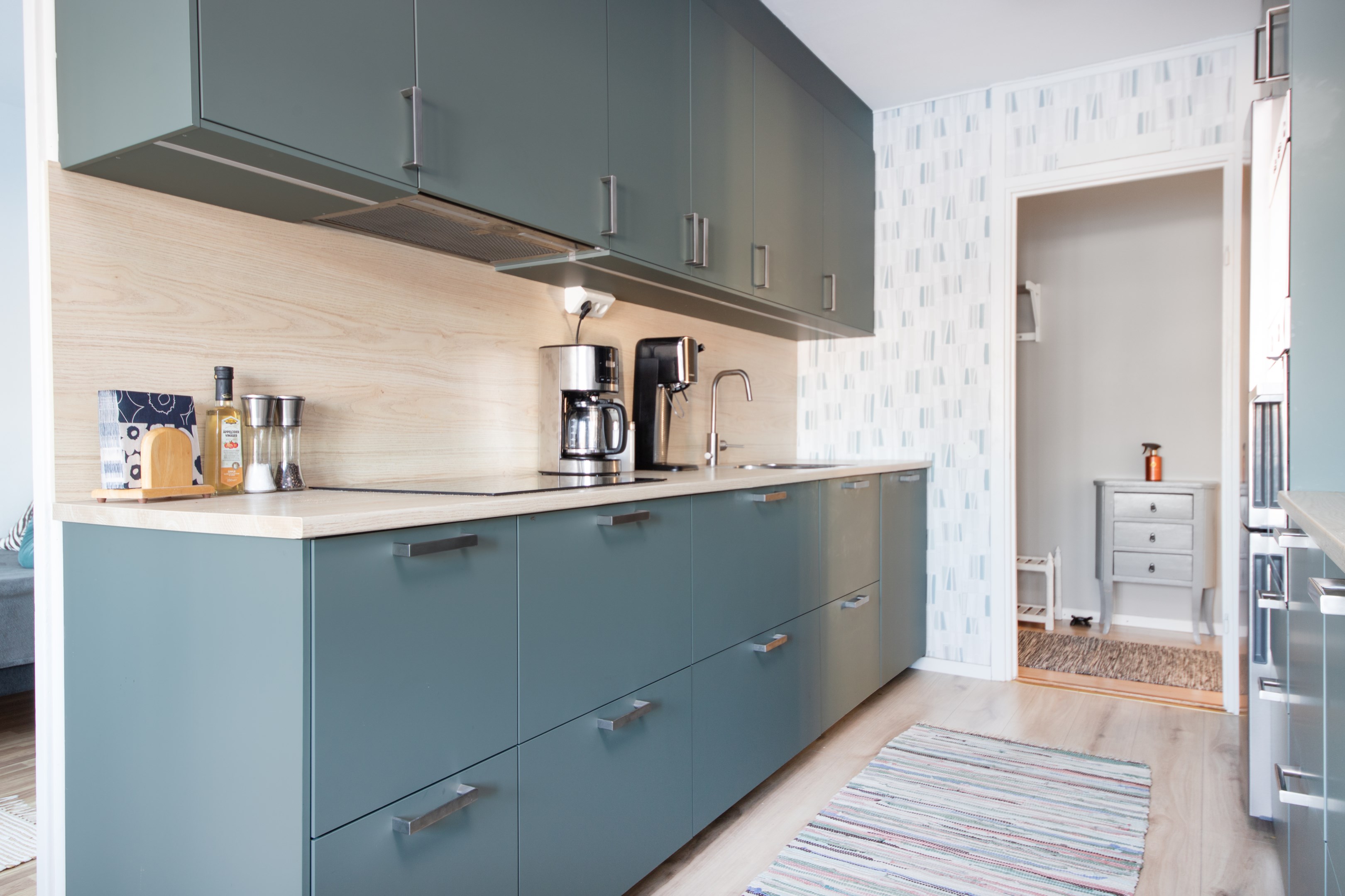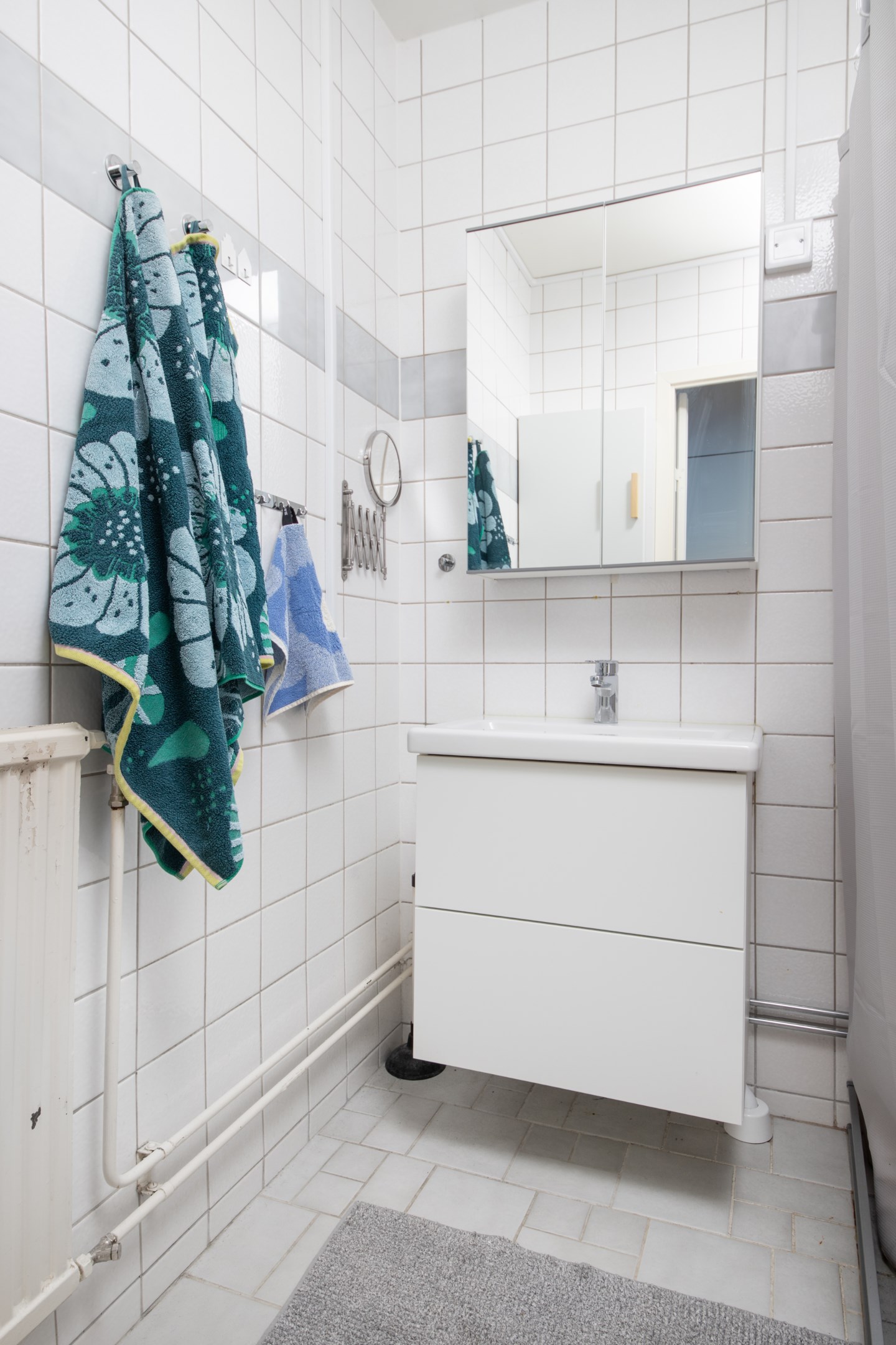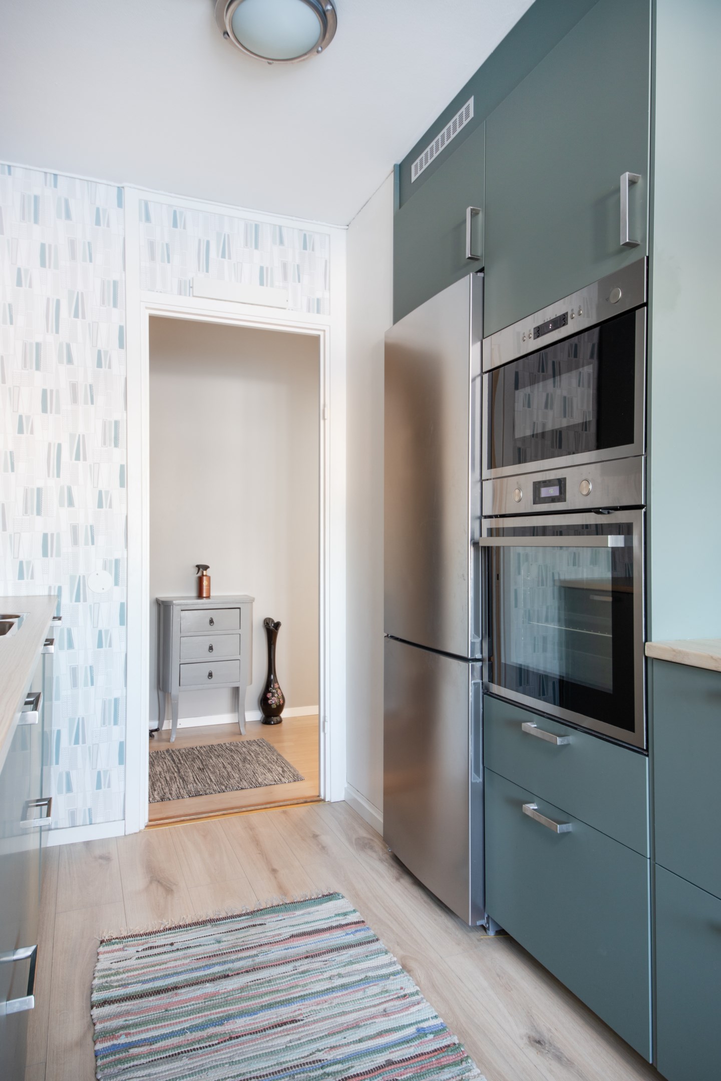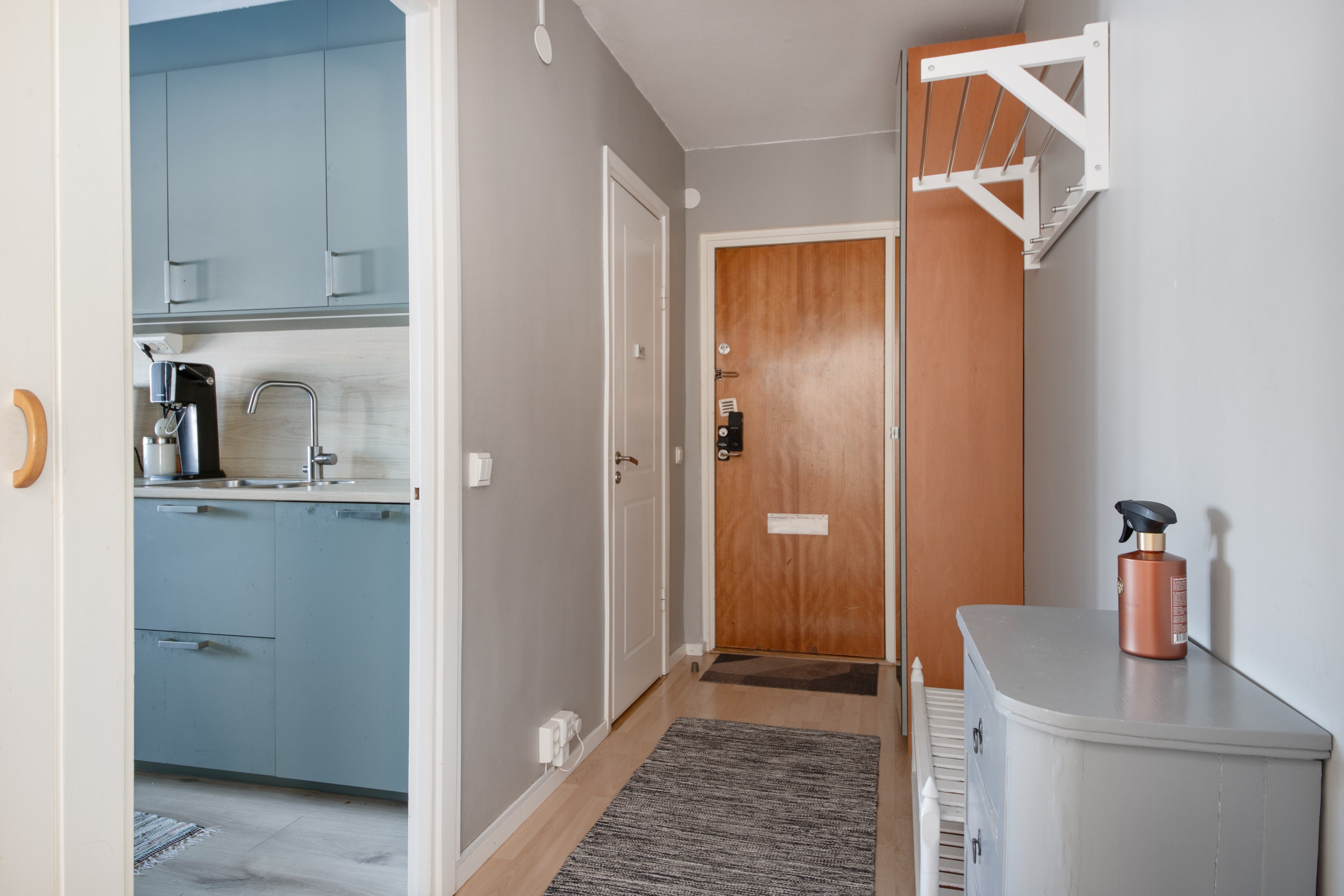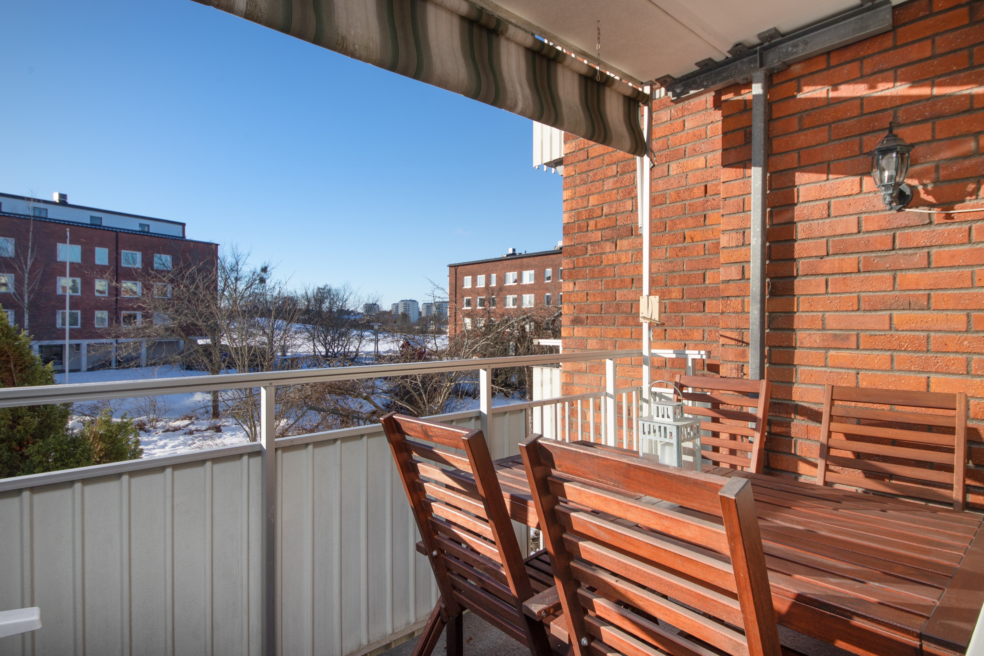 Entré in i praktisk hall med garderob och gott om plats för avhängning av ytterkläder. Laminatgolv och ljusa väggar. Intill hallen finns Wc utrustat med wc, handfat och spegel. Mycket smakfullt renoverat kök med gott om både arbetsytor och förvaringsmöjligheter. Matchande bänkskiva och stänkskydd. Köket är utrustat med delad kyl/frys, integrerad diskmaskin, inbyggnadsugn, inbyggnadsmicro samt spishäll. Rymlig matplats med trivsamt fönsterläge. Två sovrum av bra storlek. Båda med laminatgolv och ljusa väggar. Det ena sovrummet har access från både kök och vardagsrum/inre hall. Detta sovrum har riktigt gott om garderober. Rymligt vardagsrum med fint parkettgolv, ljusa väggar och utgång till balkongen i härligt soligt söderläge. Mellan vardagsrummet och det ena sovrummet finns en inre hall med gott om garderober samt ingång till badrummet. Badrummet har kaklade väggar och våtrumsmatta på golvet. Här finns ny handfatskommod och nytt spegelskåp. Utöver detta är badrummet även utrustat med dusch och tvättmaskin.