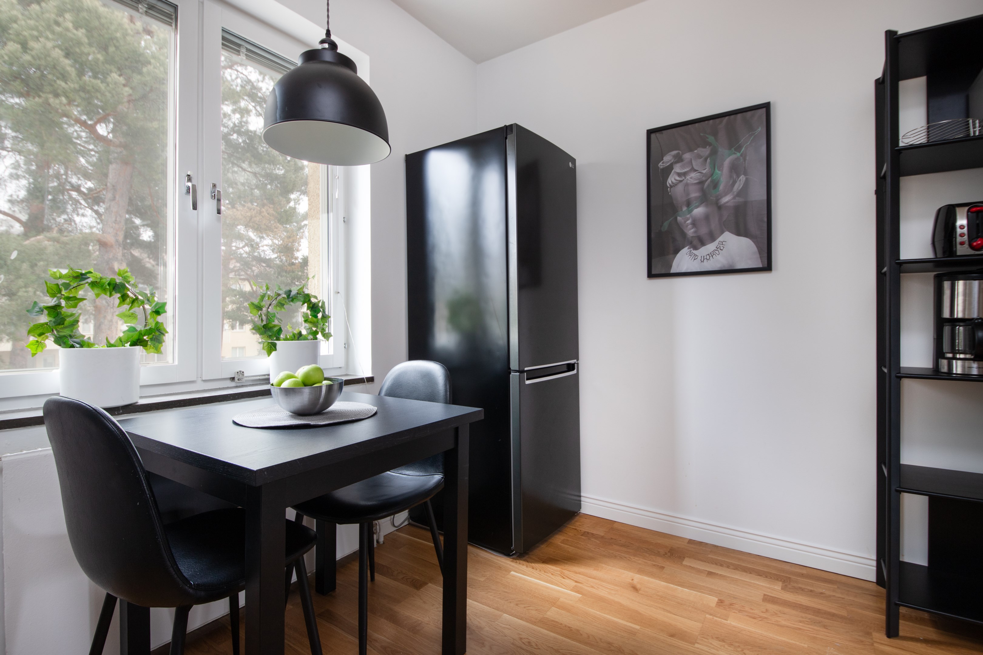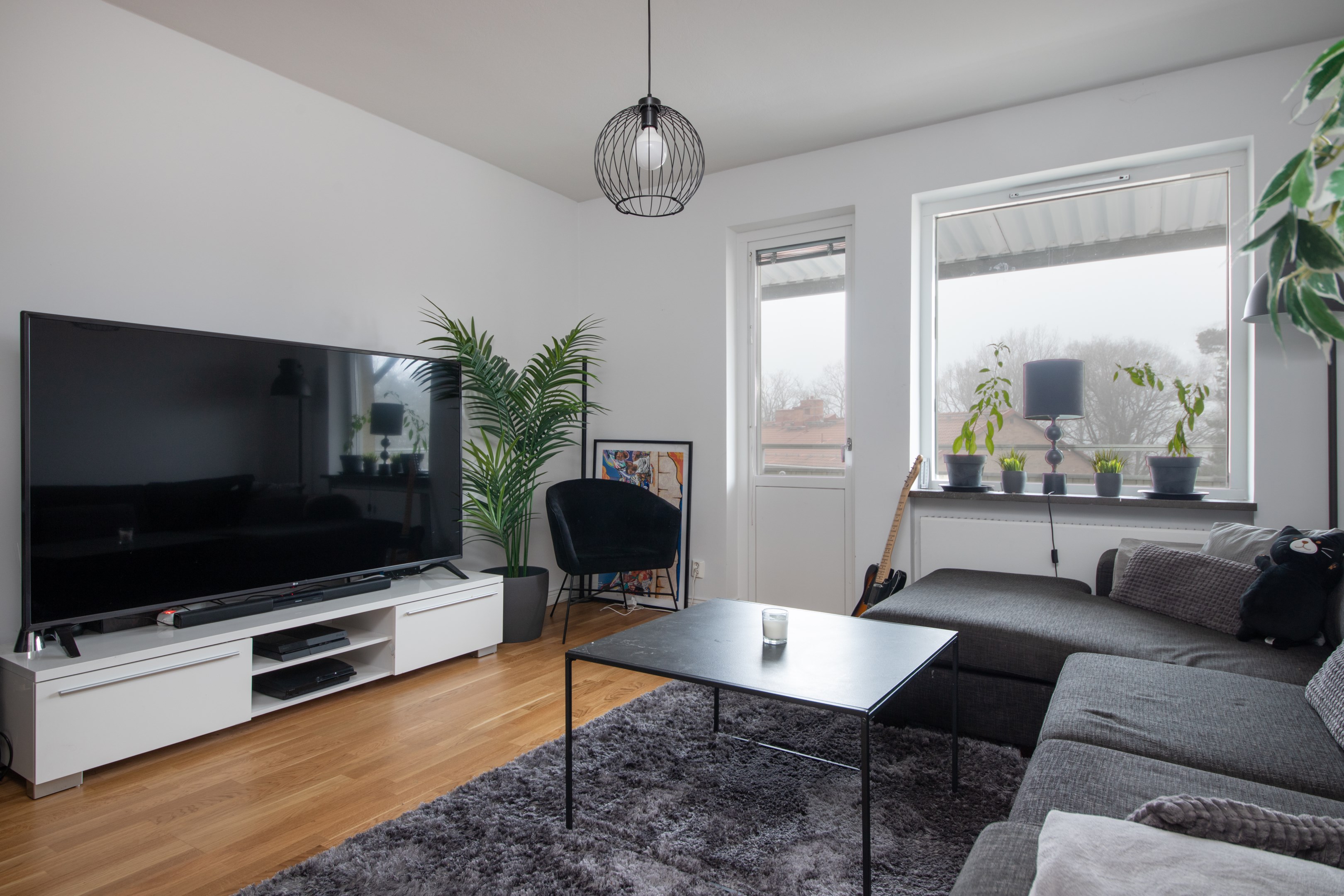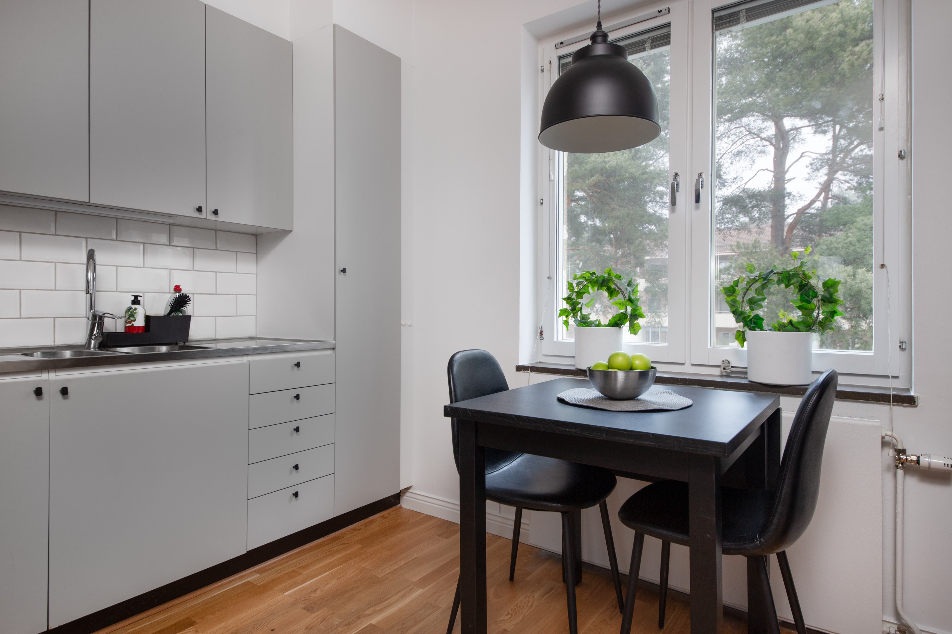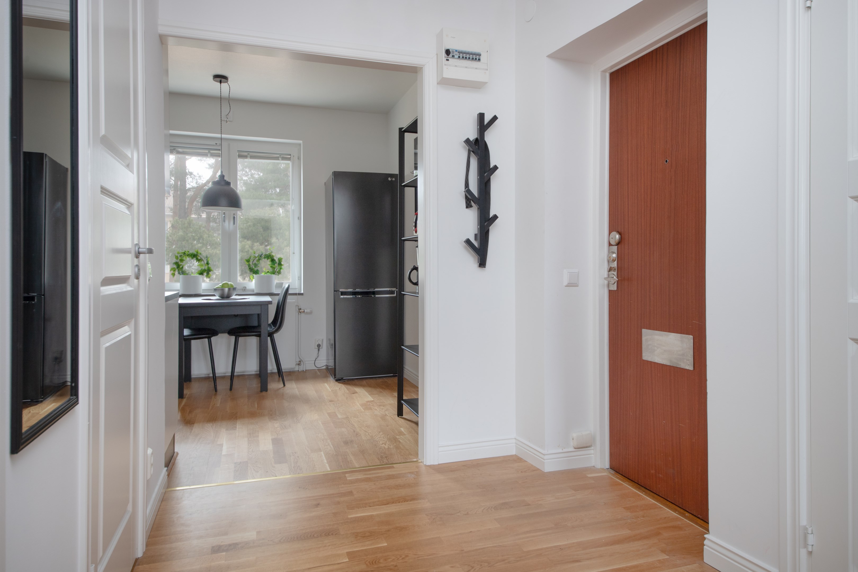 Entré in i hall med parkettgolv och ljusa väggar. Plats för avhängning av ytterkläder. Gott om förvaring med två praktiska klädkammare. Renoverat i helkaklat badrum i mörka rogivande nyanser. Här finns dusch, handfatskommod, spegel, wc samt både tvättmaskin och torktumlare. Rymligt kök med plats för matbord framför fönstret. Gott om arbetsytor i köket. Köket är utrustat med kyl/frys, spis samt fläkt. Stort vardagsrum med parkettgolv och ljusa väggar. Utgång till trivsam balkong i högt läge med härlig vy över området. Sovrum med parkettgolv, ljusa väggar och tre garderober.